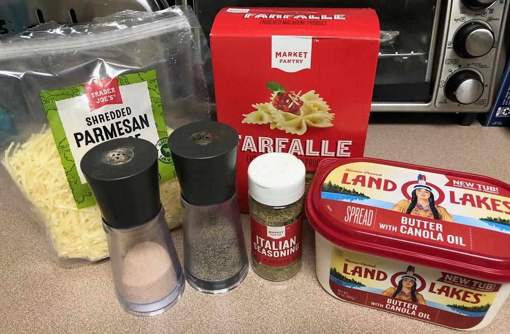 That was pretty easy. With the exception of the Italian seasoning, you probably had all of those things already on-hand, and you can run to the store and grab a shaker of Italian seasoning that will surely last you ten years. Macro-wise, you have carbs from the pasta, fat from the butter, and protein from the Parm and the pasta (yes, wheat contains more protein than you might have guessed). If you eat meat, you might apply a meat like chickens or cows or something. If you have more cooking prowess, you also might top it with a little garlic roasted broccoli for an additional bit of protein, fiber, and vitamins (but more steps and ingredients means less easy!).