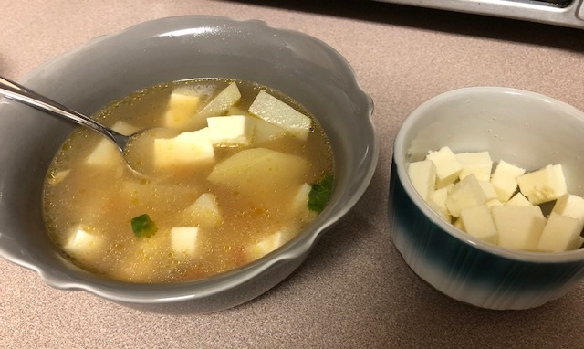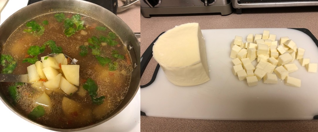 This recipe is courtesy of my mother in law. Caldo de queso a hearty soup made with potatoes and queso fresco. Queso fresco is a fresh cheese (imagine that) with a mild mozzarella-like flavor with a crumbly texture. This recipe makes a large pot.